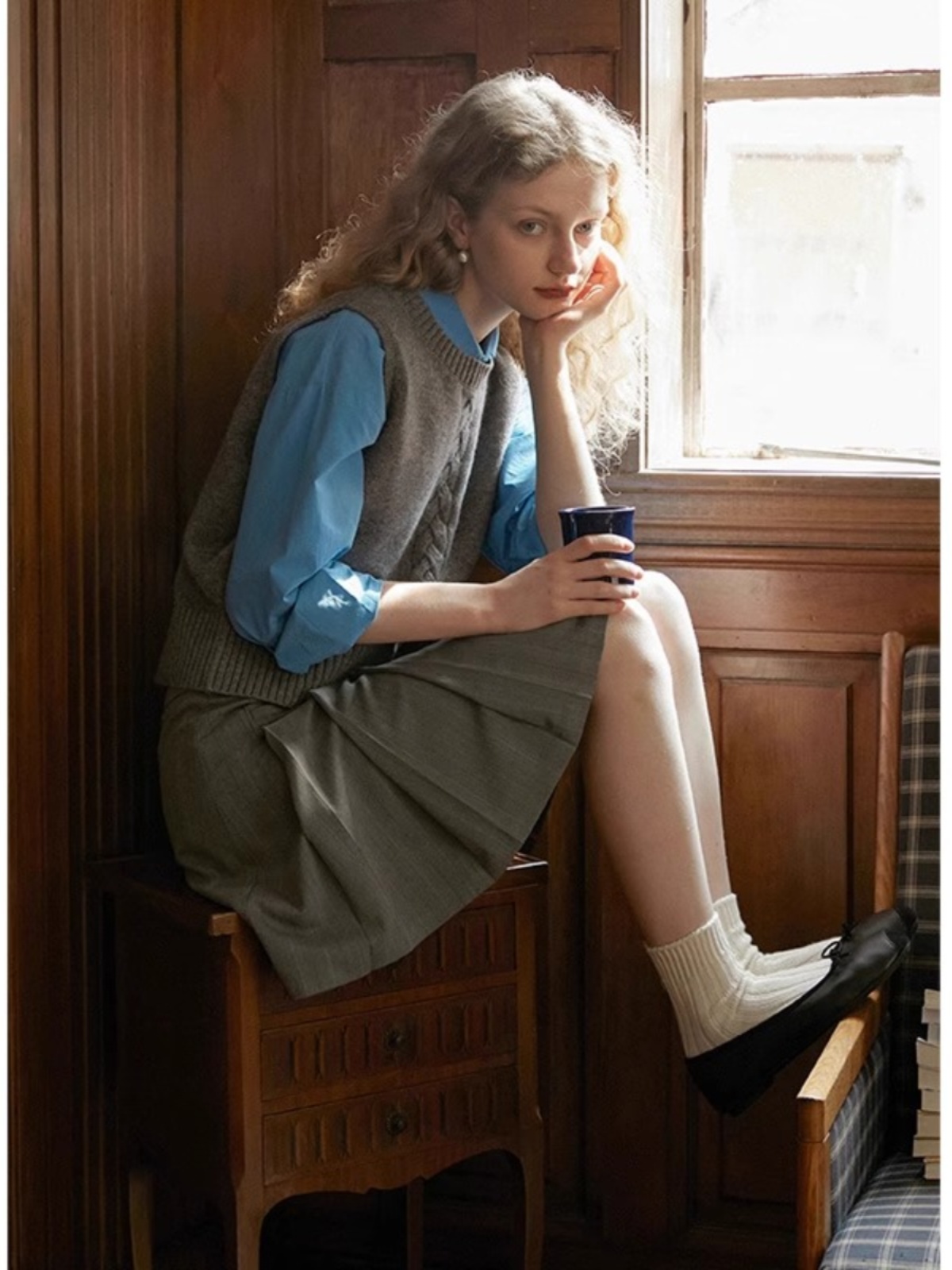クラシカルな雰囲気を醸し出すグレーのニットベストです。