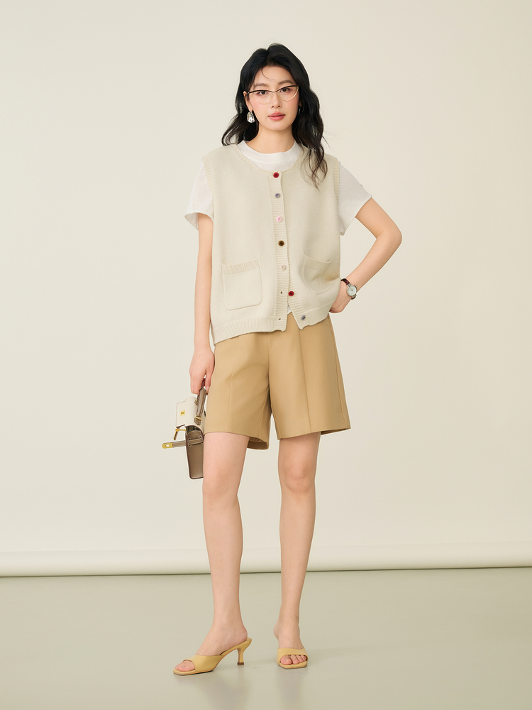 シンプルな中にこだわりを感じるニットベストは、日常使いからオフィスまで幅広いシーンで着こなせます。