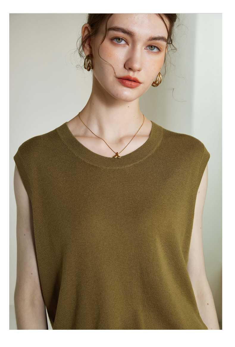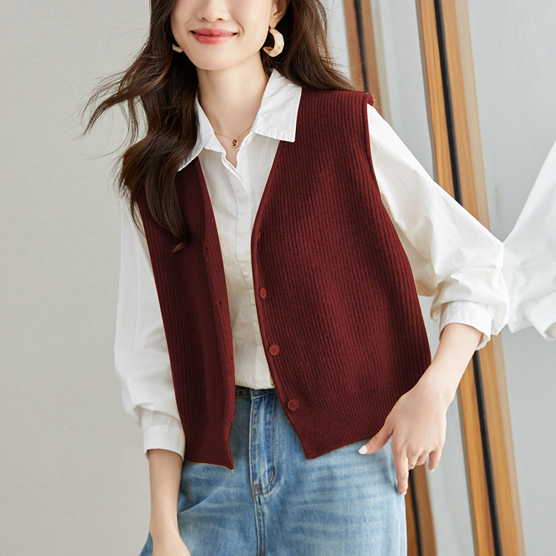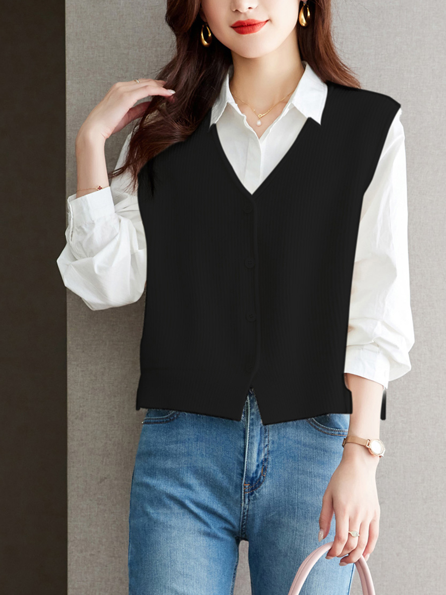 白いシャツとの重ね着で知的な印象を与えるニットベスト。