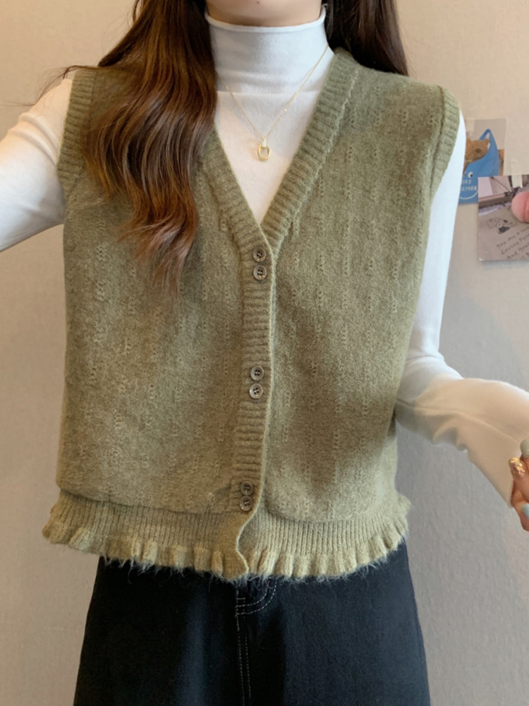 細やかな編み目と丁寧な縁取りが高級感を演出し、シャツとの重ね着で知的な印象に。