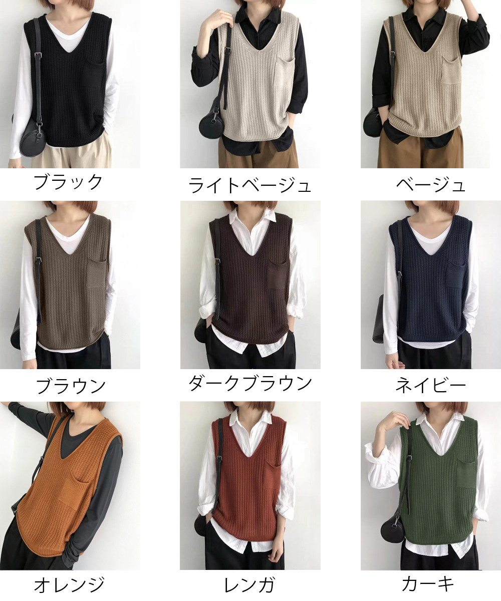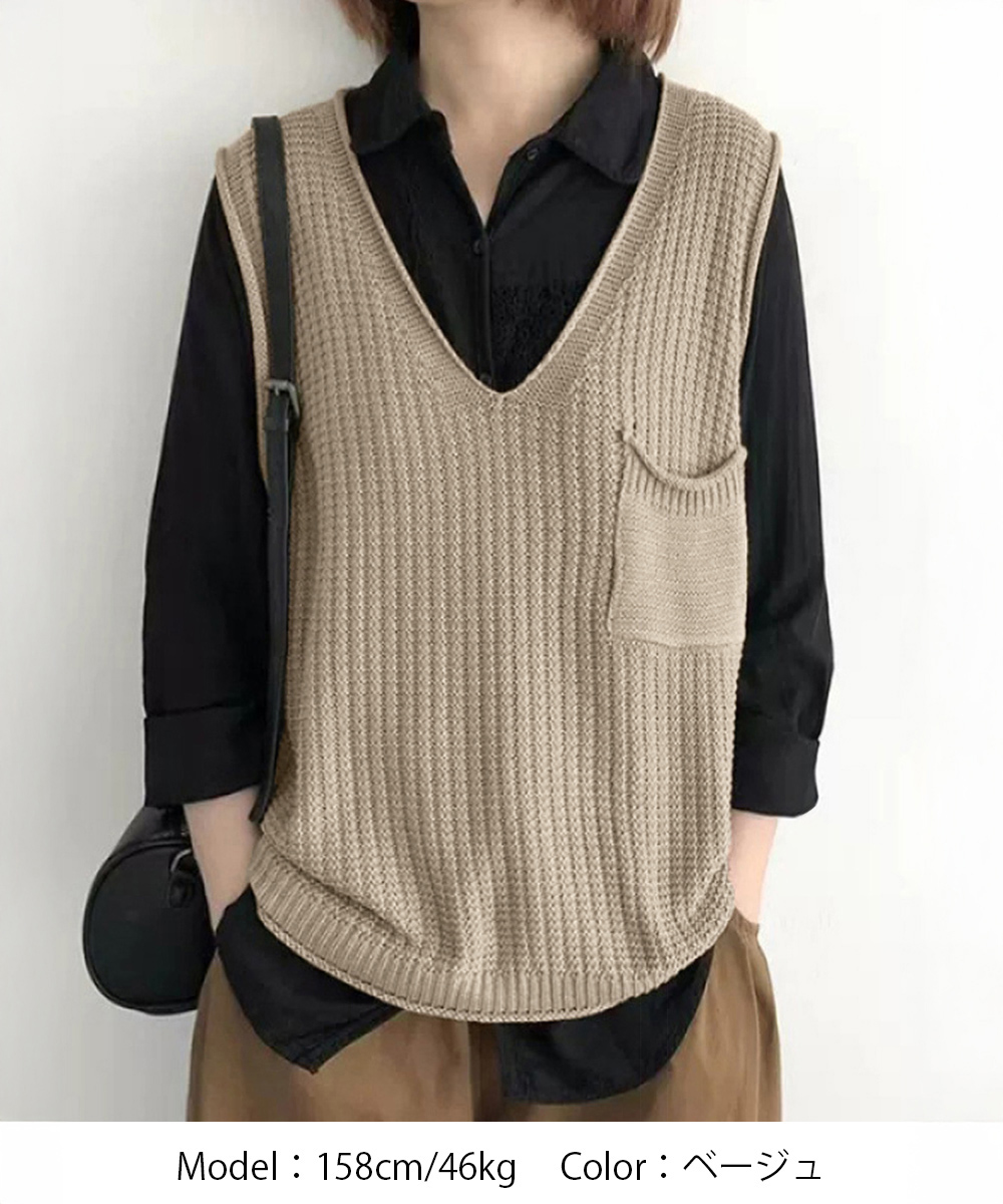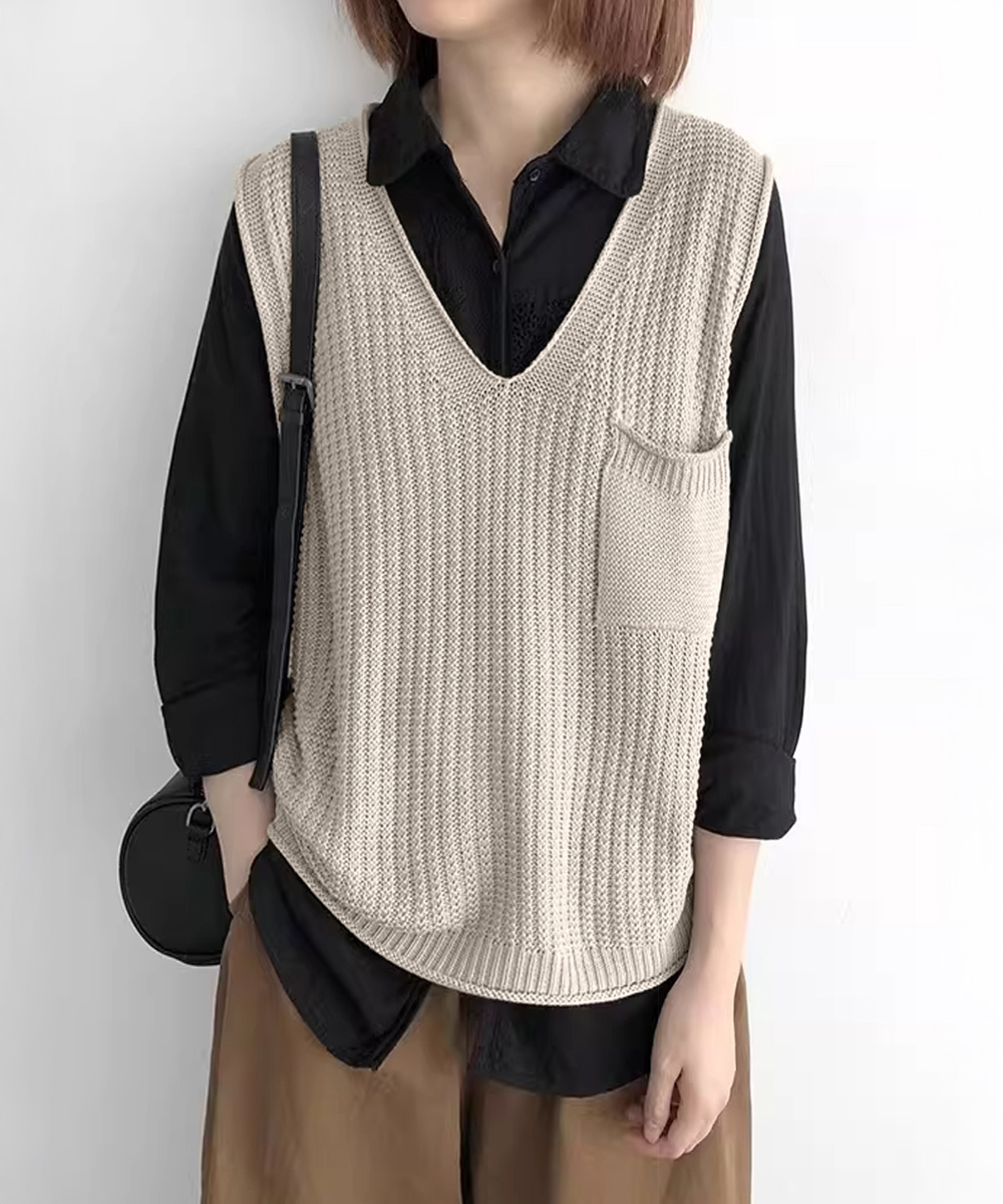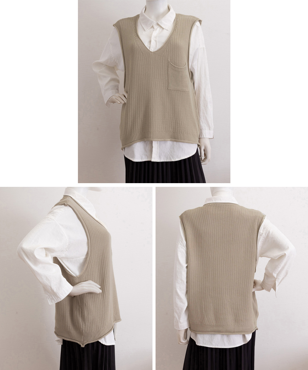 重ね着コーデにぴったりなベージュカラーのニットベスト。